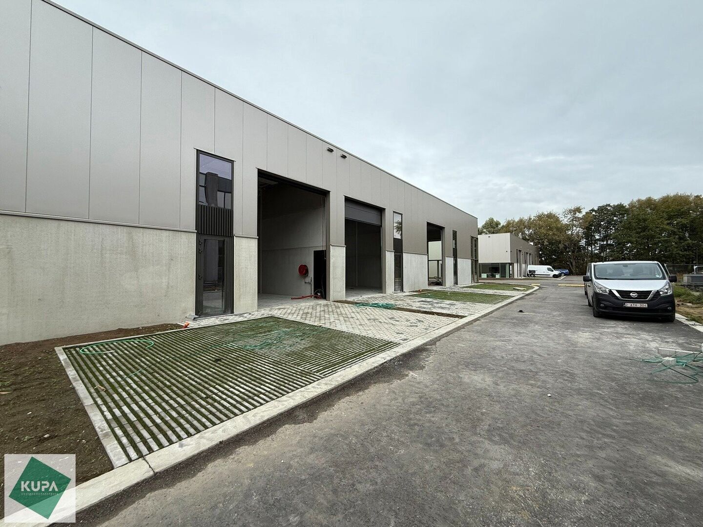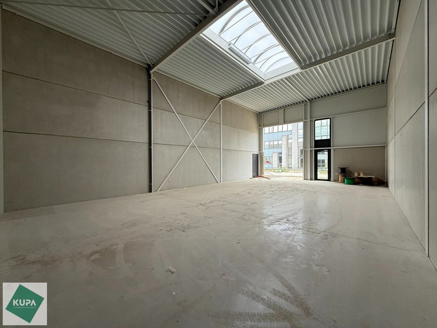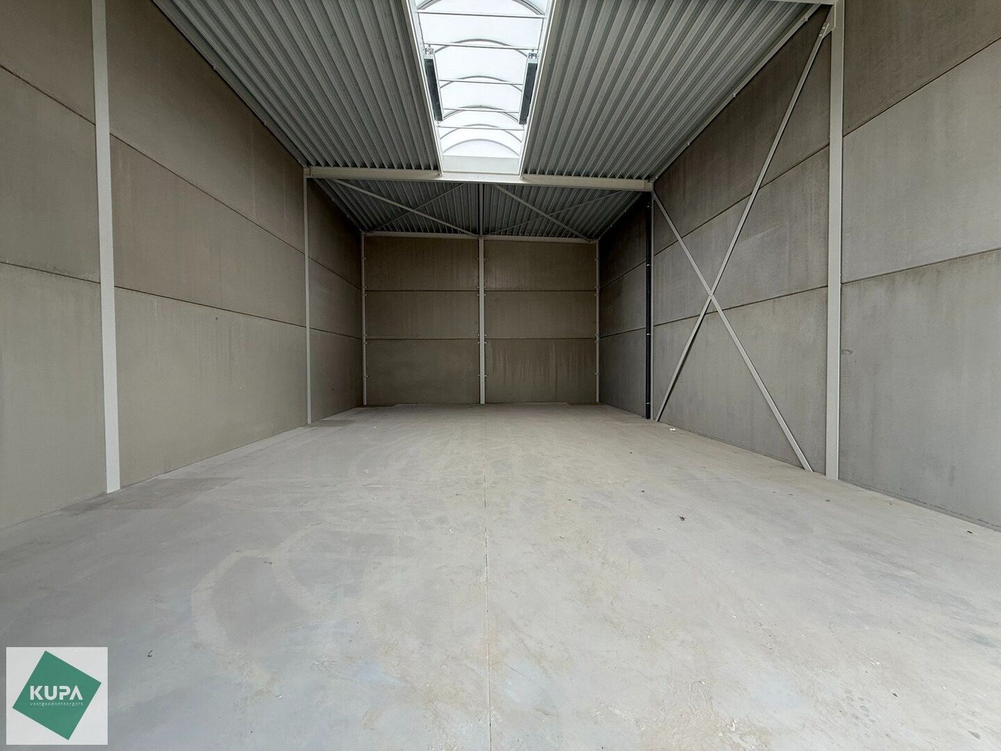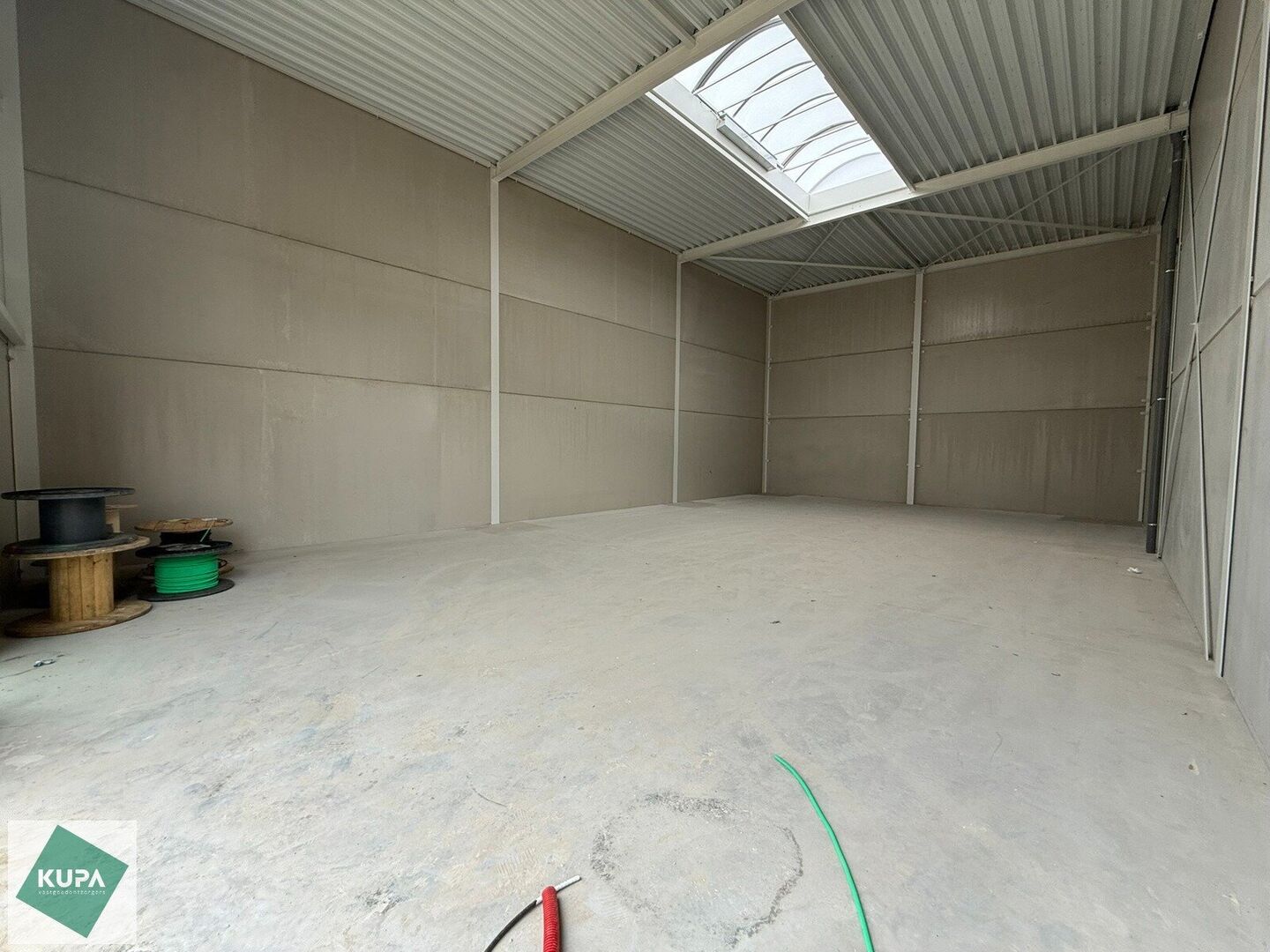 De loods van 180m² heeft een vrije hoogte van 6 meter en is gebouwd in een staalstructuur, afgewerkt met een betonnen plint en geïsoleerde sandwichpanelen en is voorzien van brandklasse C. Er is een automatische sectionale poort (4m breed x 5,2m hoog), een lichtstraat met rookluik en een duurzame polybetonvloer, verlichting en een aantal stopcontacten. Daarnaast is er per twee units een regenwaterput voorzien.