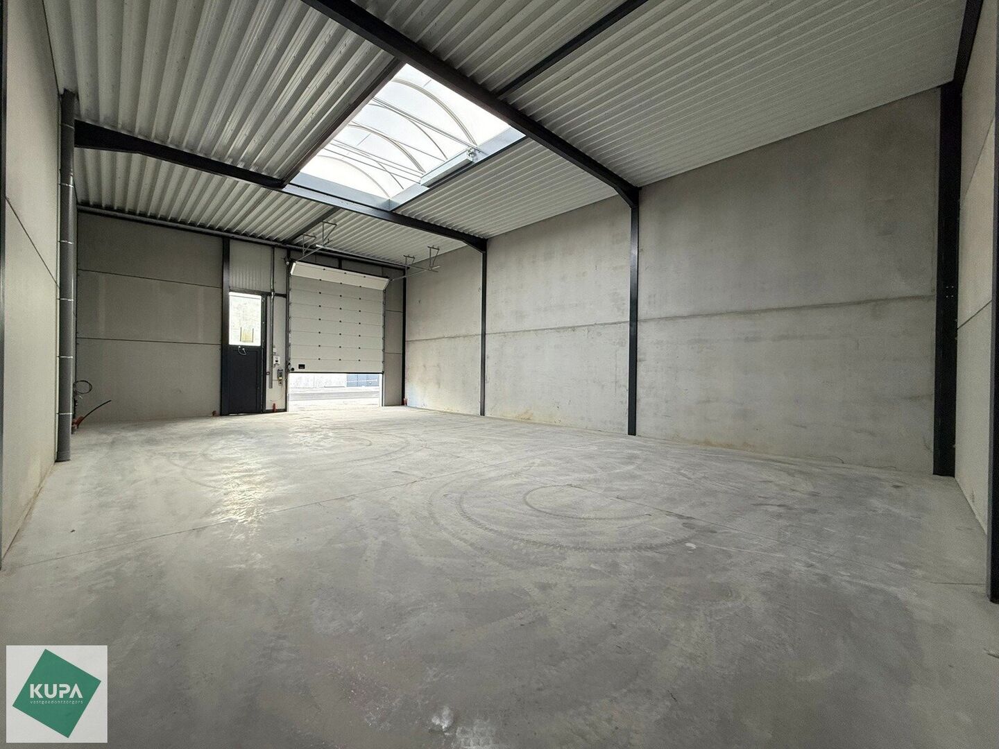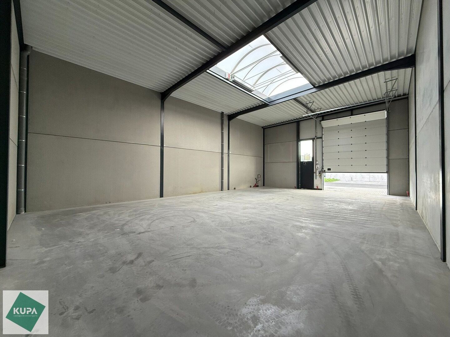 De loods van 198m² heeft een mooie vrije hoogte, is gebouw in een staalstructuur, afgewerkt geïsoleerde voorgevel in beton en sandwichpanelen. Er is een automatische sectionale poort (4m breed), een lichtstraat met rookluik en een duurzame polybetonvloer, verlichting en een aantal stopcontacten.