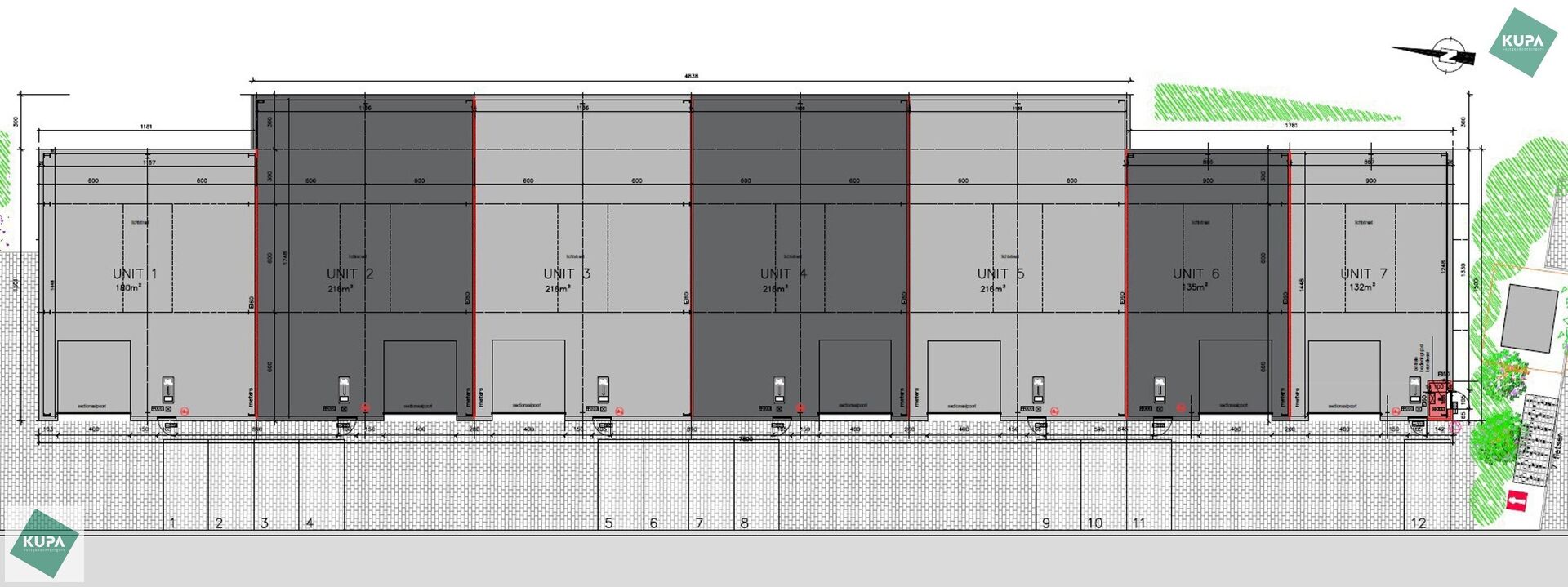 Elke unit beschikt over een regenwaterput, LED verlichting en een aantal stopcontacten. De KMO unit is ideaal voor opslag en/of productie – een uitstekende opportuniteit voor ondernemers die op zoek zijn naar een kwalitatieve en strategisch gelegen bedrijfsruimte te huur.