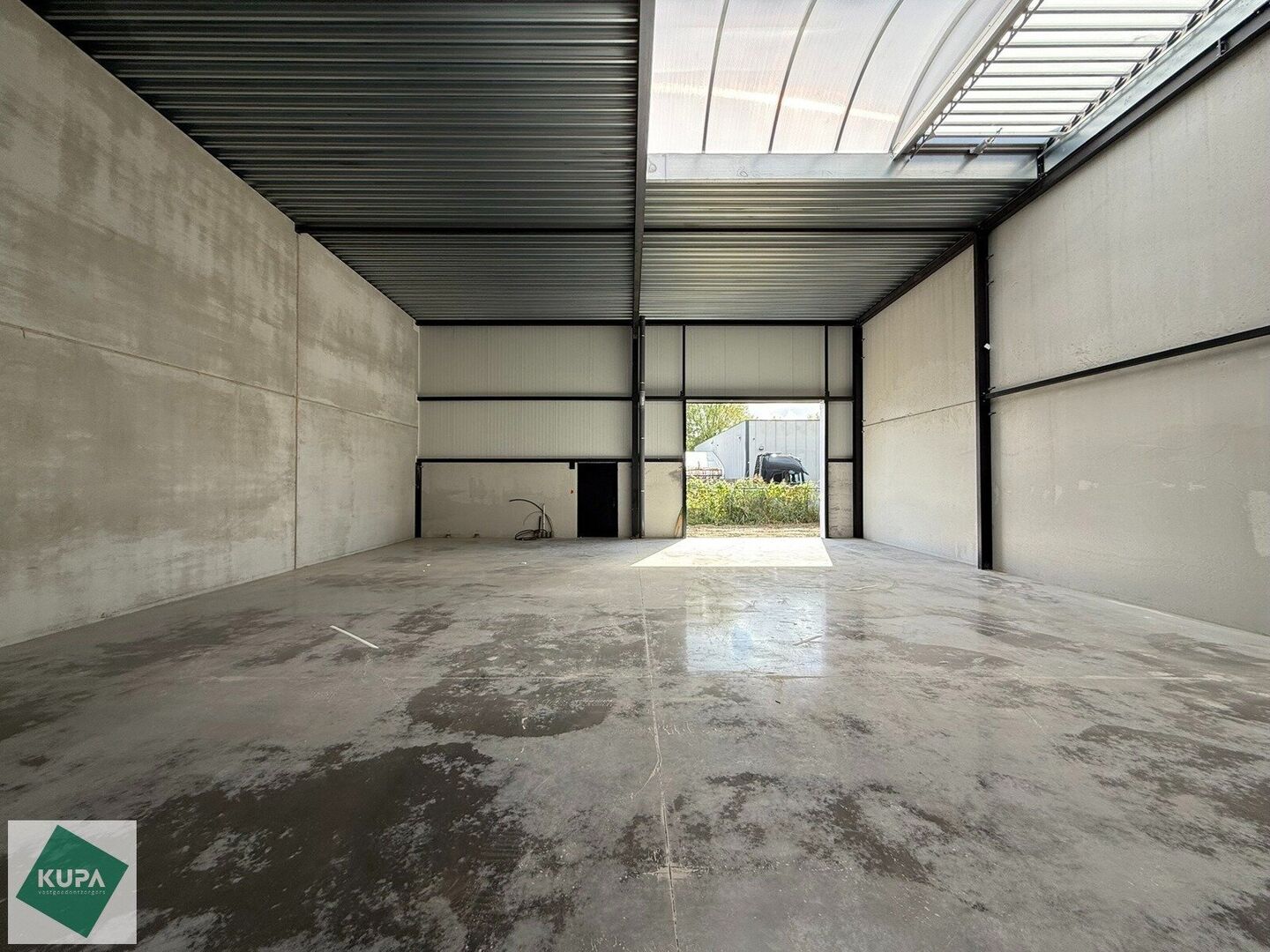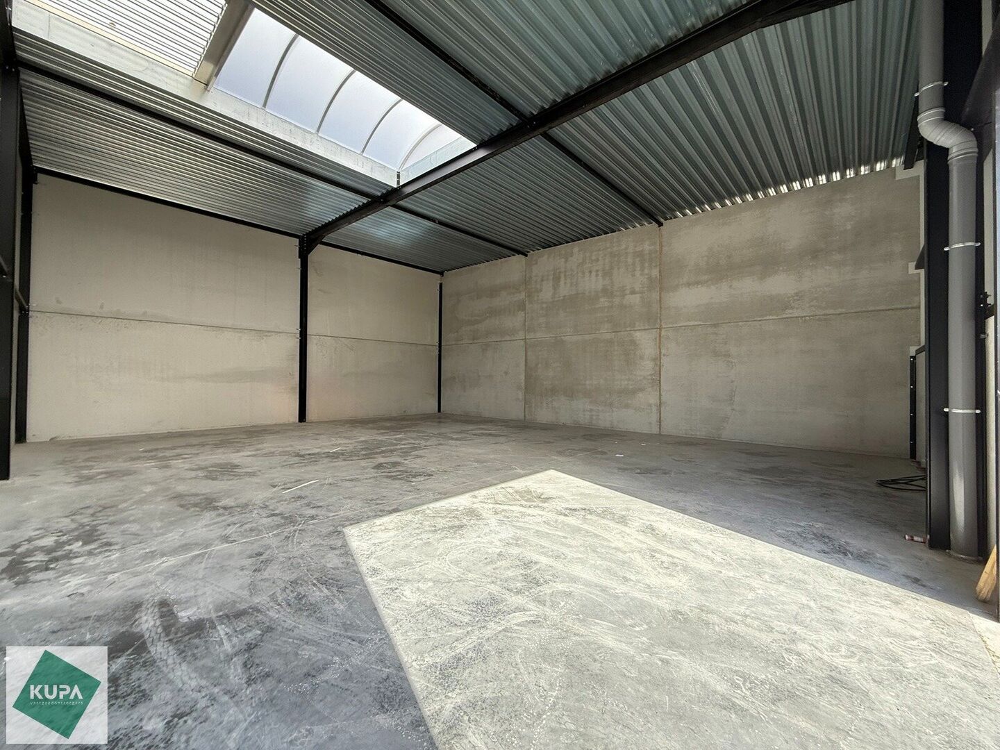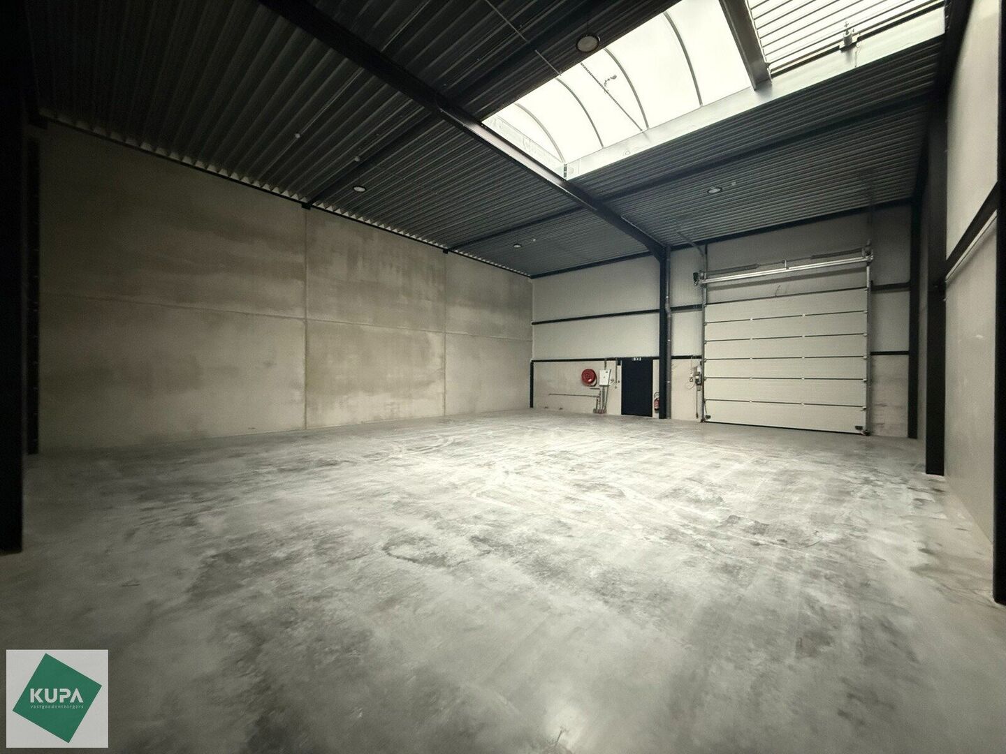 Deze nieuwbouw loods is opgebouwd uit een staalstructuur, betonplint en geïsoleerde sandwichpanelen, met tussenwanden van 14 cm beton, een geïsoleerd steeldeck, polybetonvloer (2T/m²), aluminium buitenschrijnwerk, sectionale poort (4m x 4m), RWA, buitenverlichting en branddetectie.