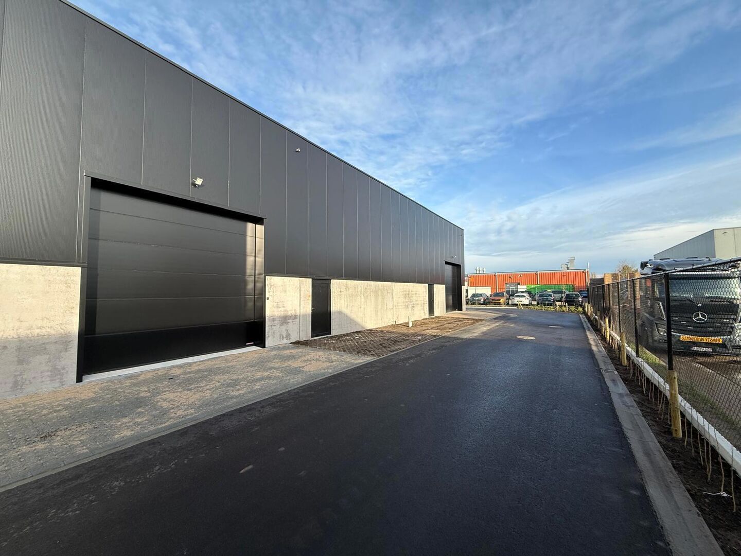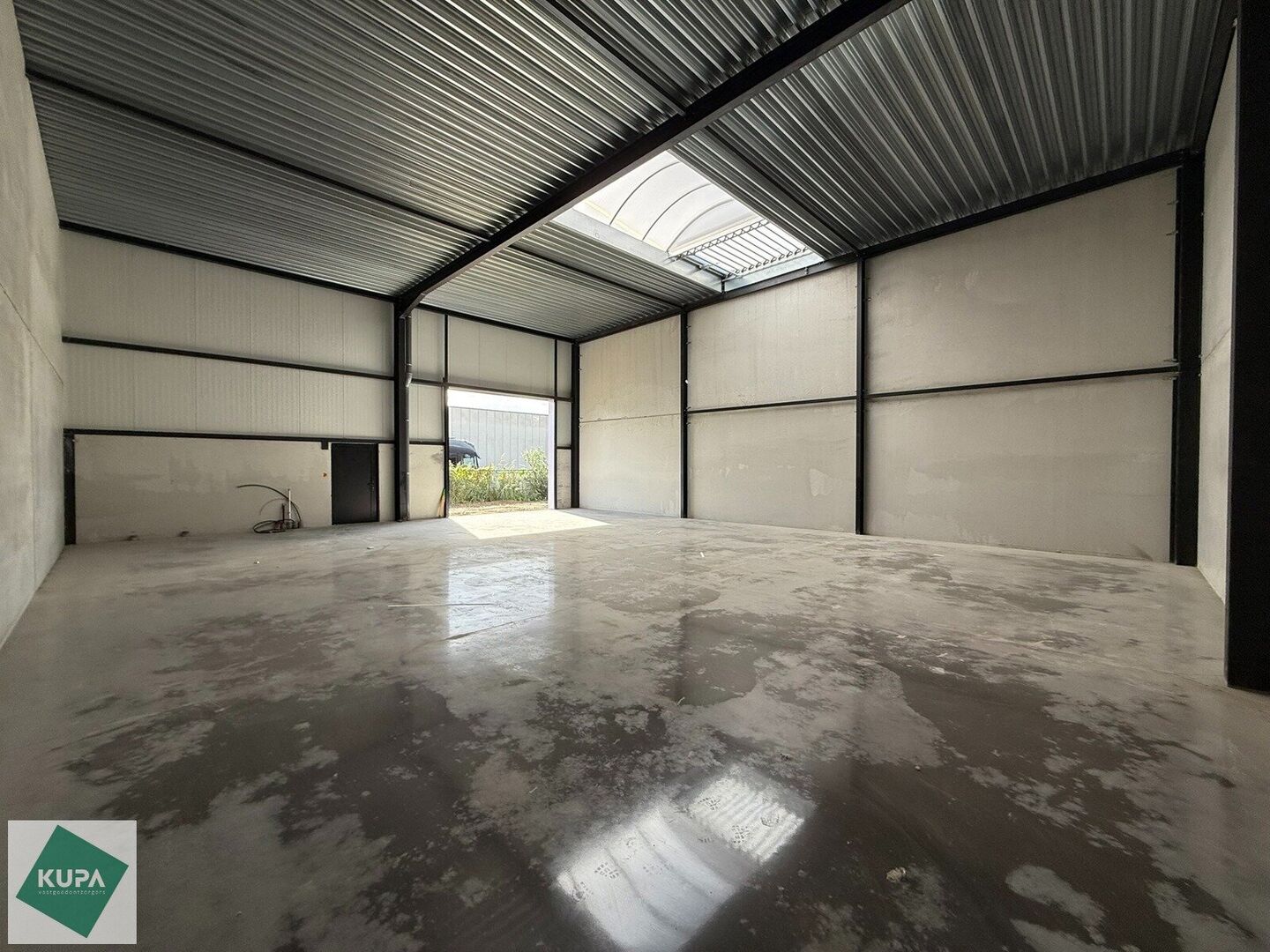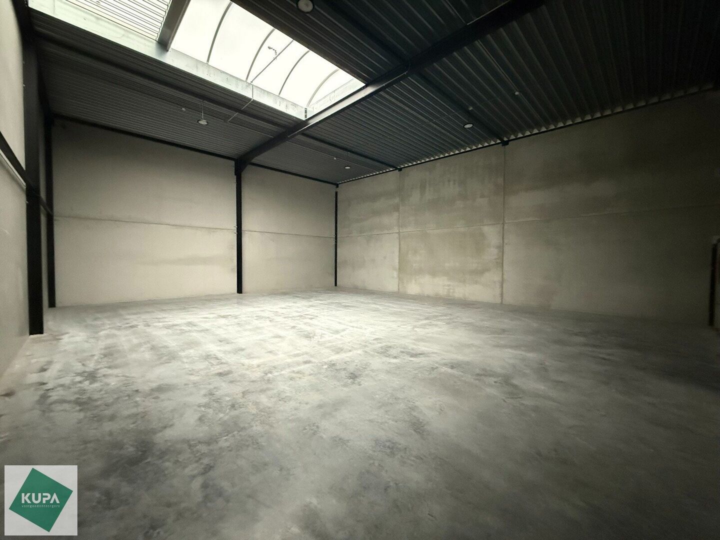 Deze nieuwbouw loods is opgebouwd uit een staalstructuur, betonplint en geïsoleerde sandwichpanelen, met tussenwanden van 14 cm beton, een geïsoleerd steeldeck, polybetonvloer (2T/m²), aluminium buitenschrijnwerk, sectionale poort (4m x 4m), RWA, buitenverlichting en branddetectie.